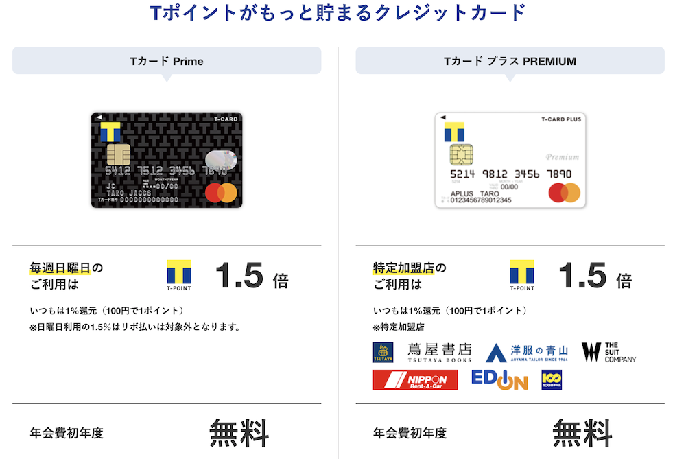 TカードPrime、TカードプラスPREMIUMは共に、100円で1ポイント貯まります。さらに年会費は初年度無料!